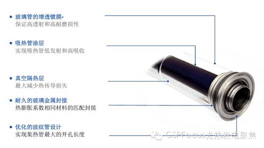 对于光热发电集热管来说,它的技术参数包括:尺寸(直径和长度),透光率,吸收率, 发射率,运行压力,真空度等。玻璃管的增透镀膜要实现高透射和高耐磨损性,其吸热管涂层要实现低发射和高吸收,其真空隔热层要最大减少热传导损失,玻璃金属封接要耐久并要达到热膨胀系数相同材料的匹配封接,波纹管设计方面也要实现最大的开孔长度。