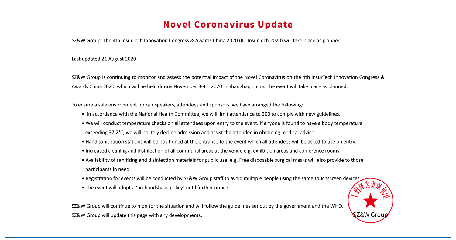 ♦ The Most Pragmatic International InsurTech Event in China ♦ 25+ Eminent International Speakers ♦ 200+ High-level Participants From Global Leading Insurers ♦ Explore the application of AI, Big Data, Blockchain, Cloud Computing, IoT, 5G and other technologies in the insurance industry, to help industry decision makers gain insight into future trends and drive innovation across the insurance industry. ♦ Special Focus on the leading InsurTech practice of industry players in period of anti-COVID 19 ♦ Attendees will be able to ask questions to the guests during the group discussion so that they can get exclusive insights on the topics they care about most ♦ 1 to 1 meeting |